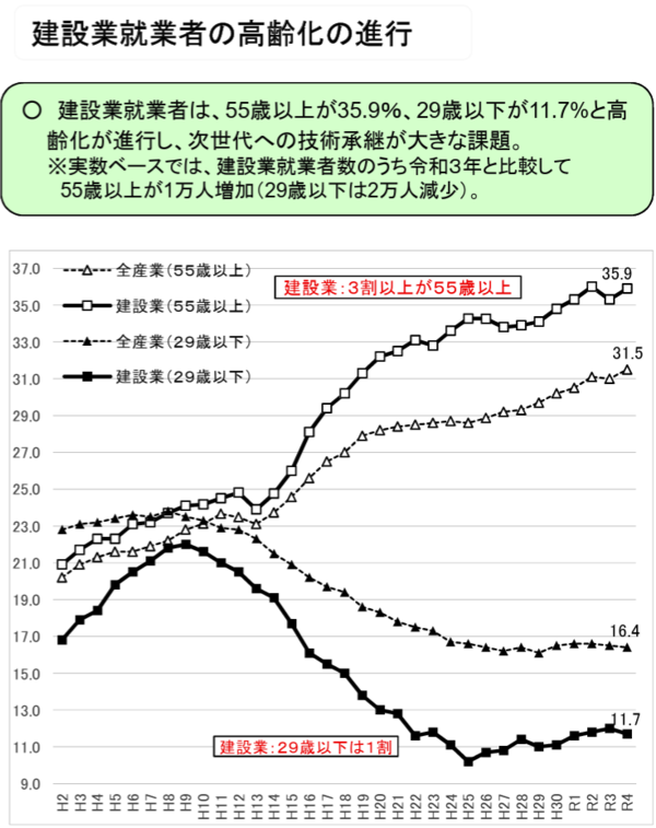 国土交通省の調査によると、建設業就業者の約3割が55歳以上で、29歳以下はわずか1割程度にとどまっています。
